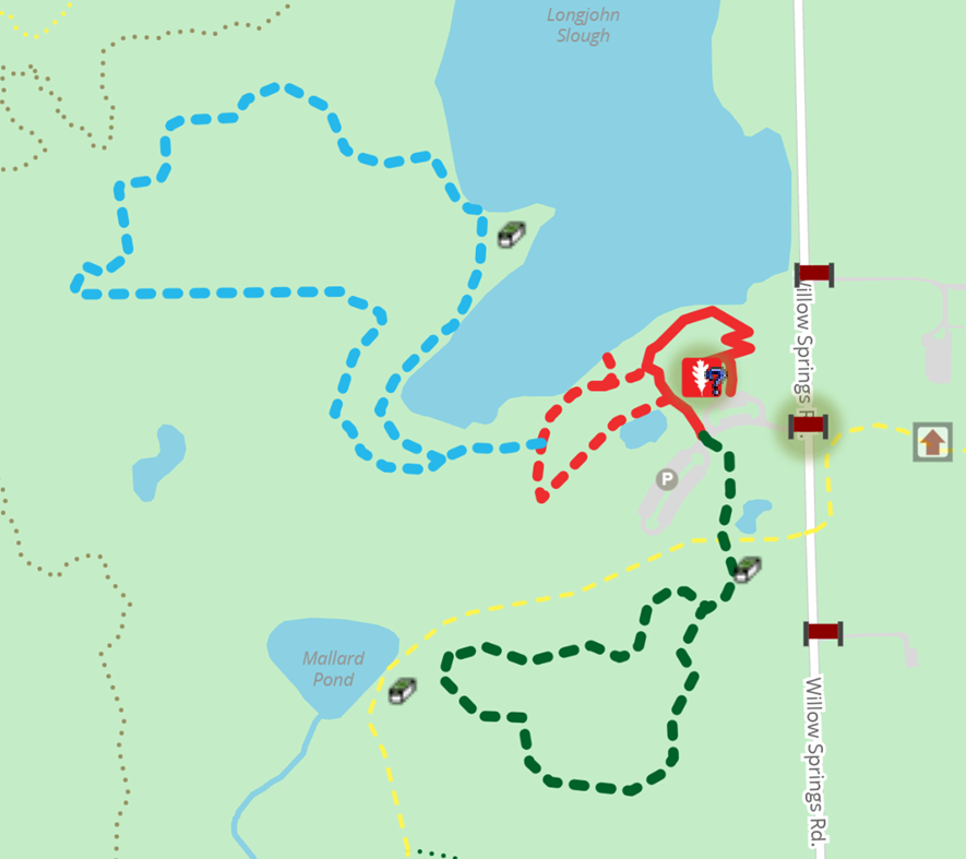 The hike will include two loops. We’ll begin by taking the left‑most curve of the blue trail (1.21 miles) to find GC1QNW1 Slough Down – Long John (Traditional Cache), then head south to search for GCB7YX2 Intersection 7 (Traditional Cache) on the green trail (0.7 miles). If conditions are right, we might even be able to hunt for GC80RYD Winston Churchill #1 (Traditional Cache) and take the more direct yellow trail back.
